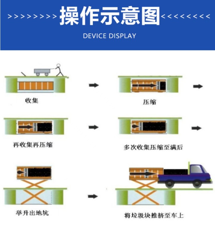◇平穩(wěn)可靠:兩側(cè)舉升,剪叉跨度大,升降平穩(wěn),無傾斜; ◇淺地坑:地坑深度僅為1.55m,保潔及維修極為方便; ◇高效率:壓實每噸垃圾時間≤10min; ◇全封閉水平壓縮:采用水平壓縮方式,垃圾壓縮密度≥0.86t/m3,垃圾壓縮后體積大大減小,從而大幅度提高轉(zhuǎn)運車輛裝載量和轉(zhuǎn)運效率,降低垃圾處理、轉(zhuǎn)運等費用; ◇動作少,故障率低,整套設(shè)備的垃圾壓縮、裝車由三個動作完成,簡單實用,各動作之間安全互鎖,防止操作人員誤操作造成安全事故,安全可靠; ◇垃圾儲存、壓縮及寄存全部在地面以下,地面上沒有垃圾散落,對環(huán)境影響較小,環(huán)保性好;垃圾壓縮后密度高,水份少,可避免汽車運輸中的垃圾散落、污水滴漏現(xiàn)象,避免二次污染; ◇土建費用低,占地面積小,可以不蓋大型工作間,既節(jié)約了投資,也縮短了工期; ◇留有專門的維修窗口,維修保養(yǎng)方便; ◇設(shè)有固定式操作和遙控器兩種操作模式,方便實用; ◇自動化程度高,可大幅提高工作效率,降低勞動強度。