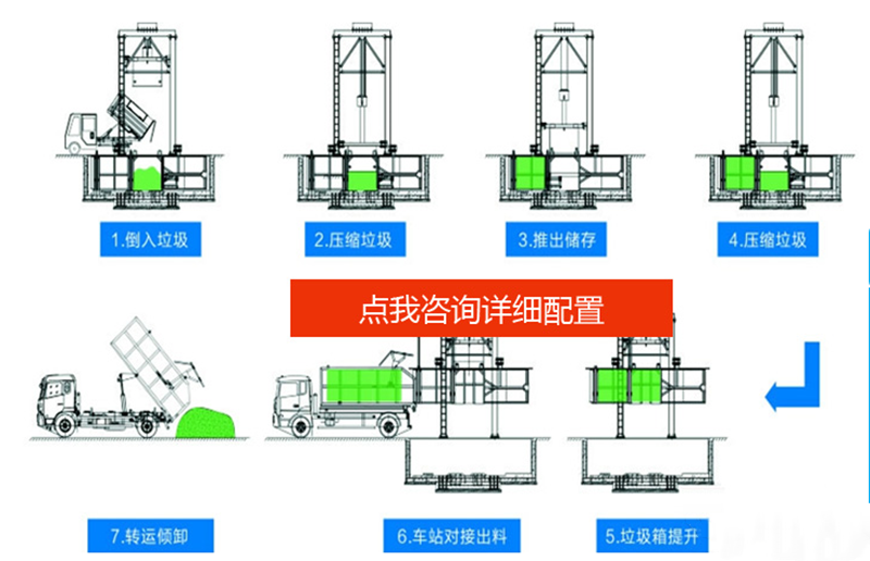 5.設(shè)有垃圾儲(chǔ)存箱,適合集裝箱式散裝垃圾運(yùn)輸車卸料,減少運(yùn)輸費(fèi)用。
